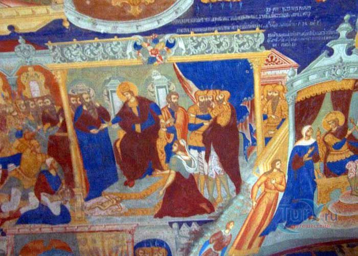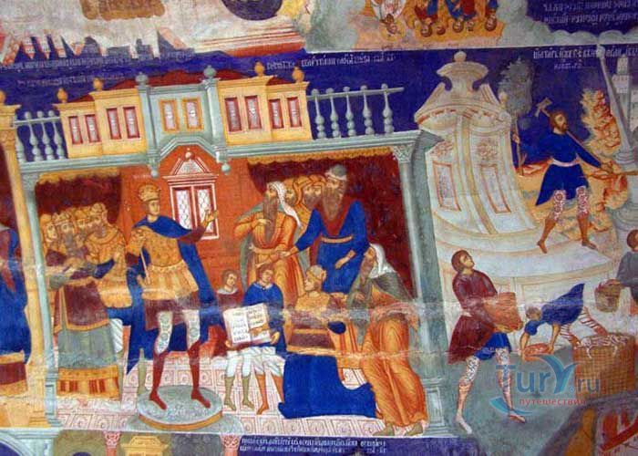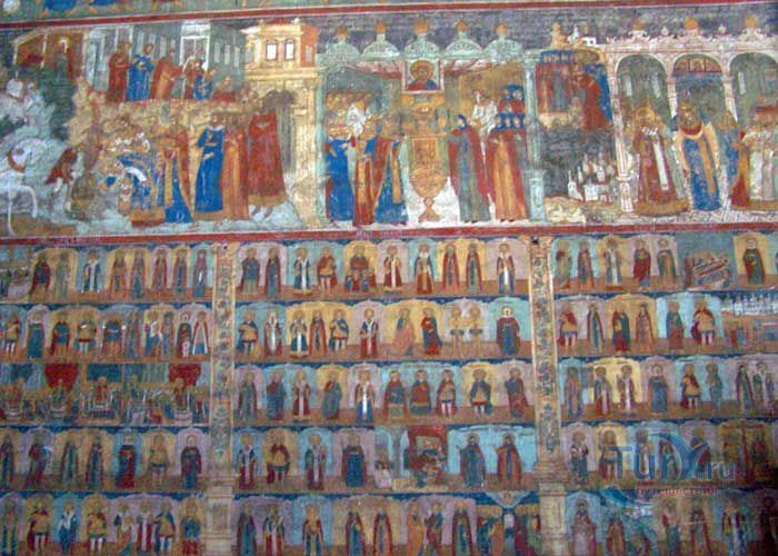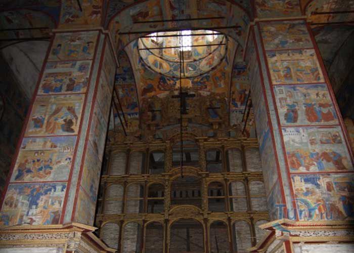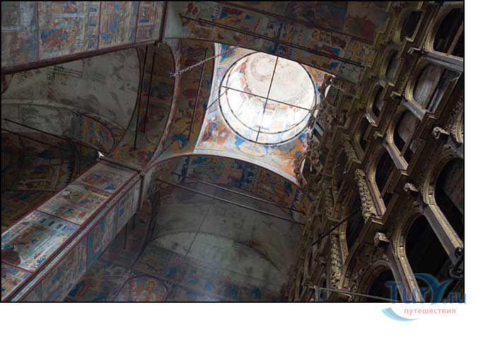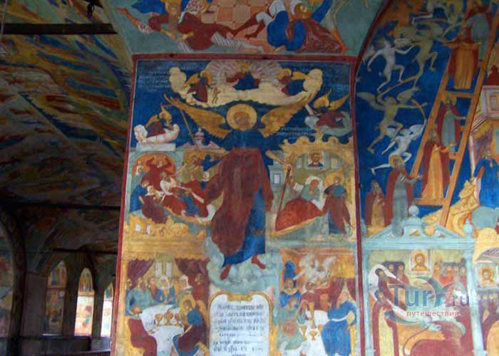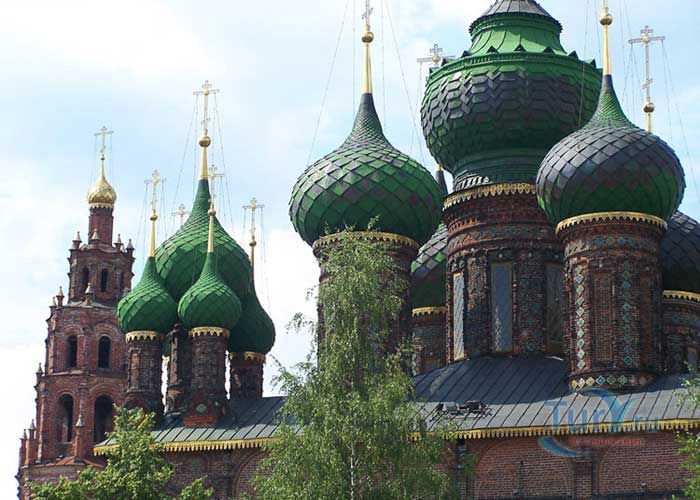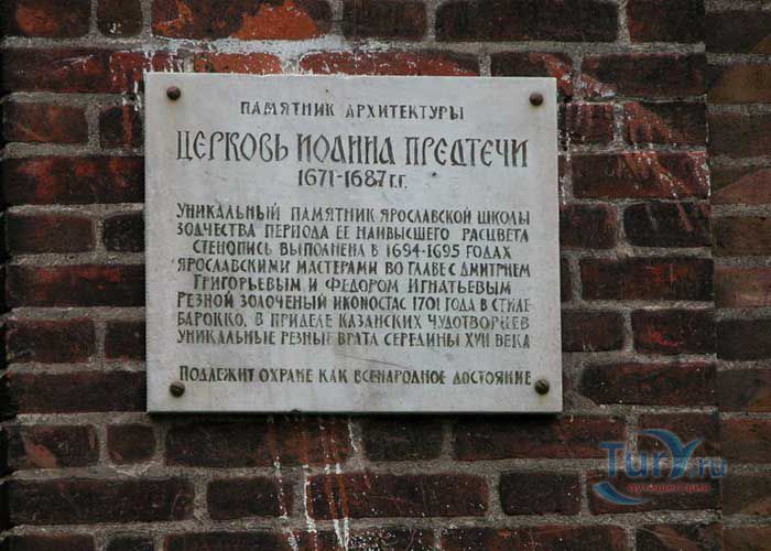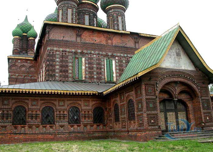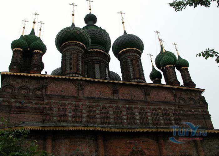 Церковь Иоанна Предтечи в Ярославле строилась с 1671 по 1687 год в Толчковской слободе, на правом берегу реки Которосли. Роспись велась в 1694-1695 годах артелью ярославских живописцев во главе с Дмитрием Плехановым и Фёдором Игнатьевым. Пятнадцать глав церкви разбиты на три группы. Церковь Иоанна Предтечи уникальный памятник архитектуры и древнерусской живописи. Это последний шедевр знаменующий собой апогей в развитии ярославской архитектурной школы. Небольшой комплекс состоит из церкви Иоанна Предтечи, колокольни и Святых ворот. С алтарной стороны галереи замыкают равные по высоте основного здания приделы, увенчанные малыми пятиглавиями. Этот новаторский приём, соединивший в одну композицию три пятиглавых группы, принёс памятнику мировую известность. Необыкновенно живописный силуэт церкви поражает разнообразием перспектив и соотношением объёмов. Его дополняет 45 метровая, отдельно стоящая, многоярусная колокольня построена в 1690 году. Декоративное убранство храма невероятно насыщено - кирпичные узоры, красочные изразцы, росписи апсид, дверей и ставен всё это создаёт образ фантастического, неземного сооружения.