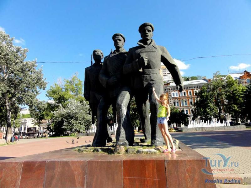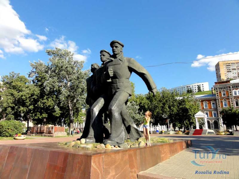 Летом 1918 года Восточный фронт приближался к границам Нижегородской губернии. В июне 1918 года для борьбы с белогвардейцами в Нижнем Новгороде начинается организация Волжской военной флотилии. Поздней осенью, после кровопролитных боёв на Волге и Каме, в одном из которых погиб 1 октября 1918 года комиссар флотилии Н. Г. Маркин, корабли возвращаются в Нижний Новгород. В честь Маркина переименовывают расположенную напротив Речного вокзала Сафроновскую площадь в площадь Маркина. В 1976 году было решено к 60-летию Великой Октябрьской революции на площади Маркина установить монумент героям гражданской войны. На конкурсе победил проект скульптора П. И.Гусева.