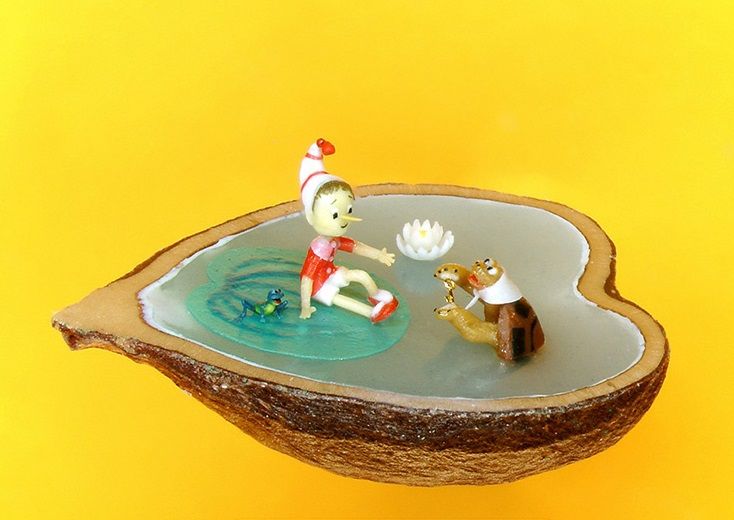 - фигурки известных мультперсонажей, стоящие на маковых зернышках и яблочных косточках