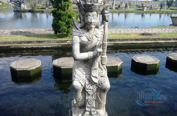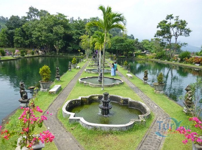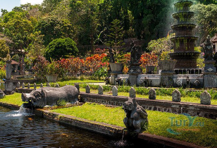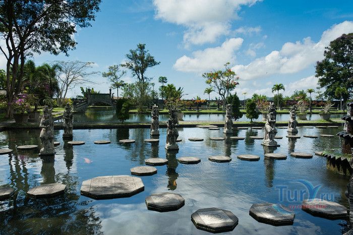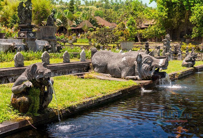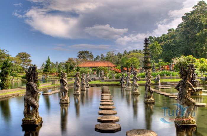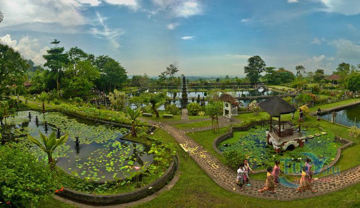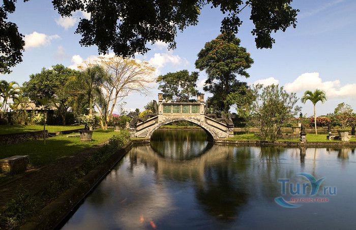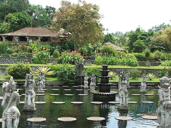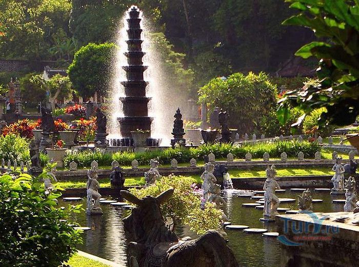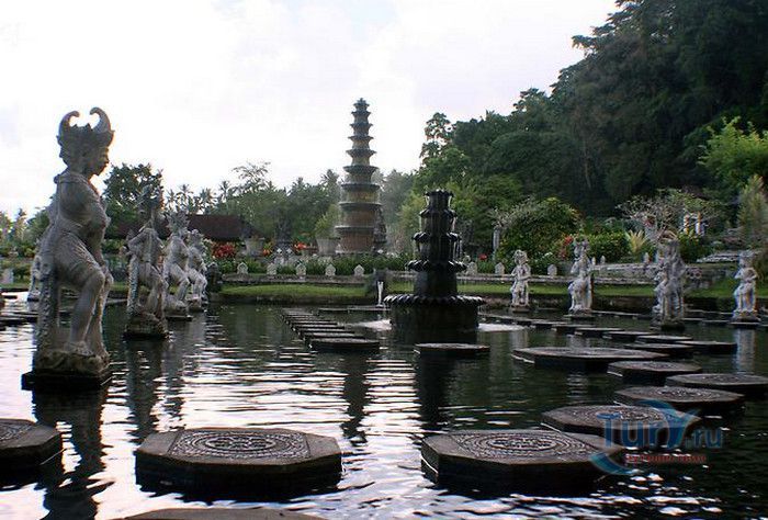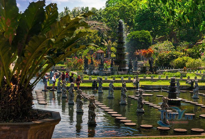 Водный Дворец Тирта Ганга расположен в Индонезии, в восточном Бали, в регентстве Карангасем. Раджа Карангасема Анак Агунг Англурах Кетут построил дворец в 1946 году для своей семьи и посвятил его священным водам Ганга. В 1963 году, из-за извержения вулкана Агунг, Тирта Ганга был полностью разрушен, королевская семья вынуждена была покинуть его. Водный дворец был восстановлен потомками раджи в 1979 году и ныне предстаёт перед посетителями в своём былом великолепии. Дворцово-парковый комплекс занимает территорию площадью 1,2 гектара. Вокруг дворца раскинулся пышный тропический сад с бассейнами, прудами, фонтанами, купальнями, каменными мостиками и статуями. Водный дворец разделён на три уровня, верхний уровень символизирует мир богов, средний - мир людей, а нижний - мир демонов. На нижнем уровне находится большой пруд со статуями и круглыми ступенями, "лежащими" на воде, по ним можно прогуляться и понаблюдать за карпами кои, населяющими водоём. Следом расположен бассейн с 10-метровым фонтаном, одиннадцать уровней которого выполнены в виде цветов лотоса. Основание фонтана украшено каменными скульптурами. Под старым деревом баньяна находится источник, вода которого считается священной, она используется во время религиозных церемоний, а также в качестве источника питьевой воды. Купание в бассейне со священной водой, по существующему поверью, дарует молодость, здоровье и благословение богов. Средний уровень содержит несколько прудов и бассейнов, на верхнем находятся королевская резиденция, гостевые бунгало и ресторан. Посетители могут прогуляться по тропинкам парка, отдохнуть в тени деревьев или у фонтанов, отведать национальную кухню в ресторане и, при желании, остаться на ночь в одном из отелей, построенных рядом с водным дворцом Тирта Ганга.