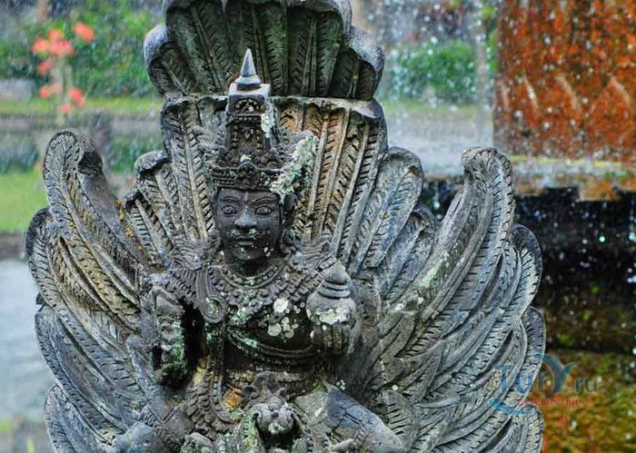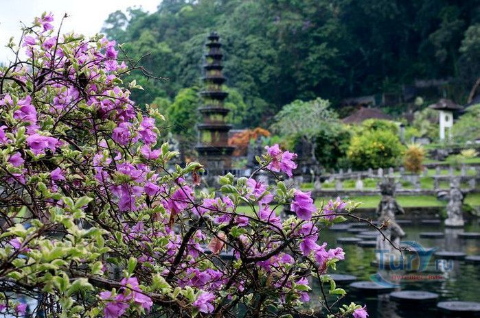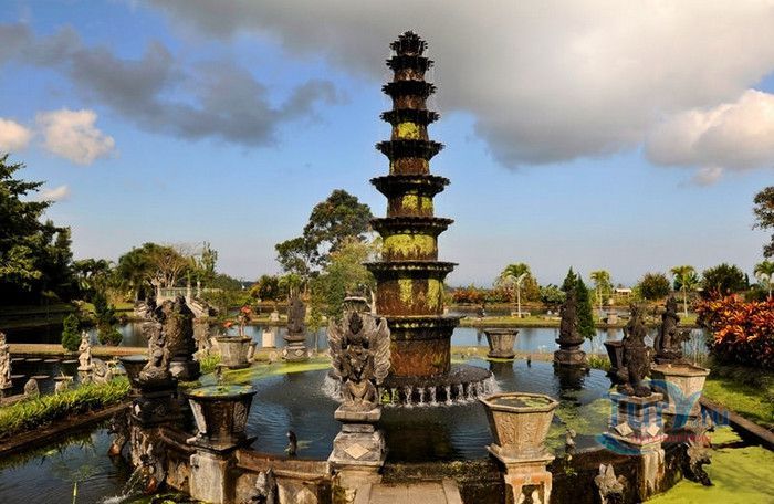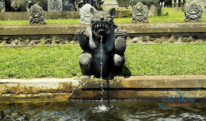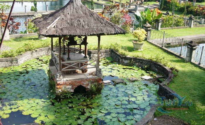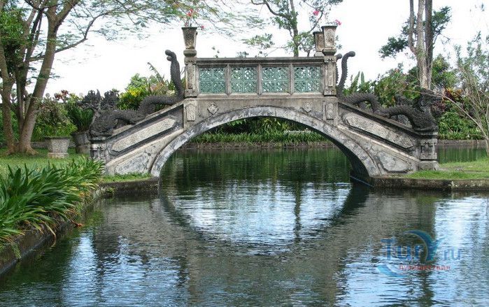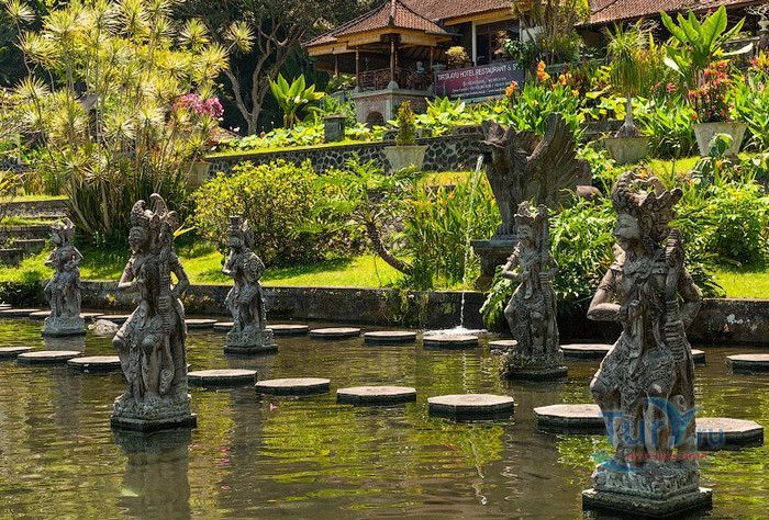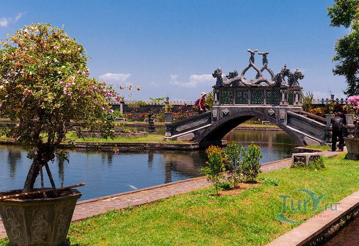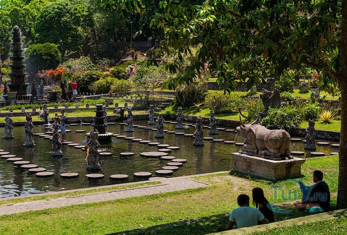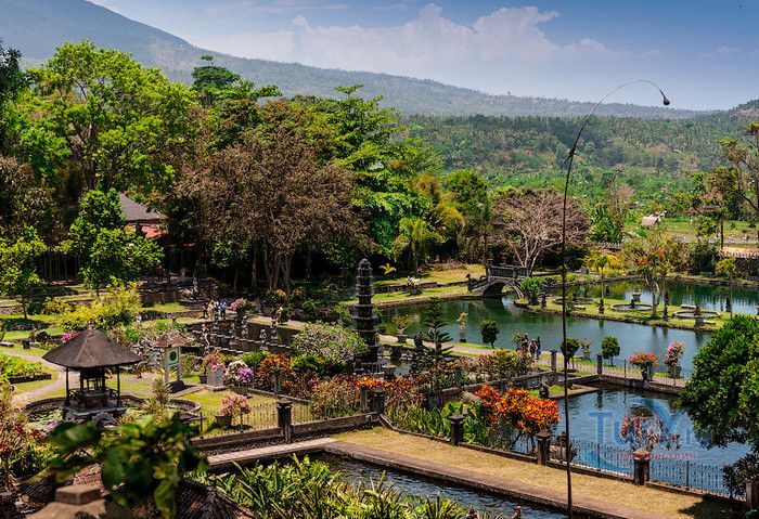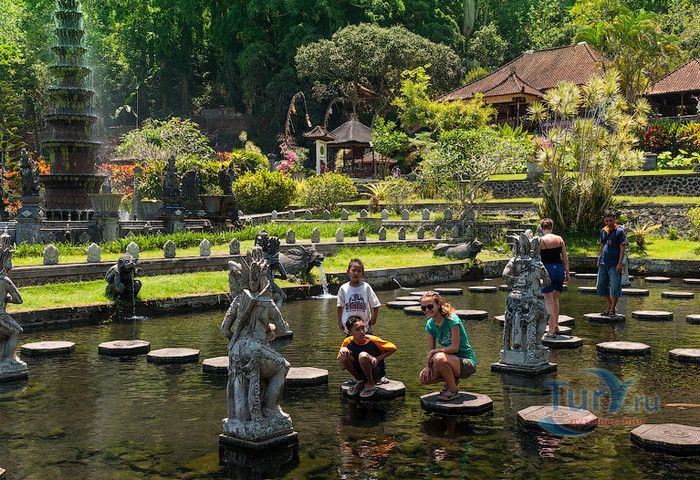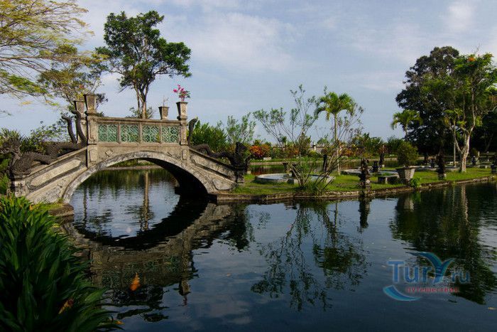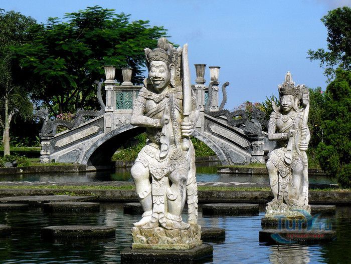 Водный Дворец Тирта Ганга расположен в Индонезии, в восточном Бали, в регентстве Карангасем. Раджа Карангасема Анак Агунг Англурах Кетут построил дворец в 1946 году для своей семьи и посвятил его священным водам Ганга. В 1963 году, из-за извержения вулкана Агунг, Тирта Ганга был полностью разрушен, королевская семья вынуждена была покинуть его. Водный дворец был восстановлен потомками раджи в 1979 году и ныне предстаёт перед посетителями в своём былом великолепии. Дворцово-парковый комплекс занимает территорию площадью 1,2 гектара. Вокруг дворца раскинулся пышный тропический сад с бассейнами, прудами, фонтанами, купальнями, каменными мостиками и статуями. Водный дворец разделён на три уровня, верхний уровень символизирует мир богов, средний - мир людей, а нижний - мир демонов. На нижнем уровне находится большой пруд со статуями и круглыми ступенями, "лежащими" на воде, по ним можно прогуляться и понаблюдать за карпами кои, населяющими водоём. Следом расположен бассейн с 10-метровым фонтаном, одиннадцать уровней которого выполнены в виде цветов лотоса. Основание фонтана украшено каменными скульптурами. Под старым деревом баньяна находится источник, вода которого считается священной, она используется во время религиозных церемоний, а также в качестве источника питьевой воды. Купание в бассейне со священной водой, по существующему поверью, дарует молодость, здоровье и благословение богов. Средний уровень содержит несколько прудов и бассейнов, на верхнем находятся королевская резиденция, гостевые бунгало и ресторан. Посетители могут прогуляться по тропинкам парка, отдохнуть в тени деревьев или у фонтанов, отведать национальную кухню в ресторане и, при желании, остаться на ночь в одном из отелей, построенных рядом с водным дворцом Тирта Ганга.