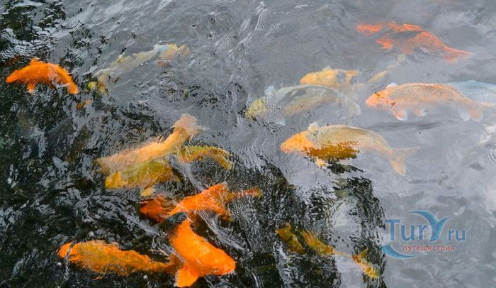 Для них здесь даже построен сад. Он окружен большим прудом, через который проложен мост, украшенный скульптурами демонов. Здесь же расположена целая система прудов и фонтанов, в которых плавают рыбы. На первом уровне также размещена водонапорная башня.